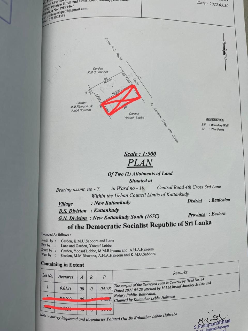 காத்தான்குடி 10ம் வார்டு, சென்றல் வீதி,(Jumaira Wedding Hall) 04ம் குறுக்கு,03ம் ஒழுங்கை, காத்தான்குடி நகரசபைக்குட்பட்ட வட்டாரத்தில், 4.78 பேச்சஸ்:54′:25.5′(அடி) அளவுகளில் நேர்த்தியான வளவொன்று பாதுகாப்பாக அடைக்கப்பட்ட நிலையில் நியாய விலையில் உடனடி விற்பனைக்கு