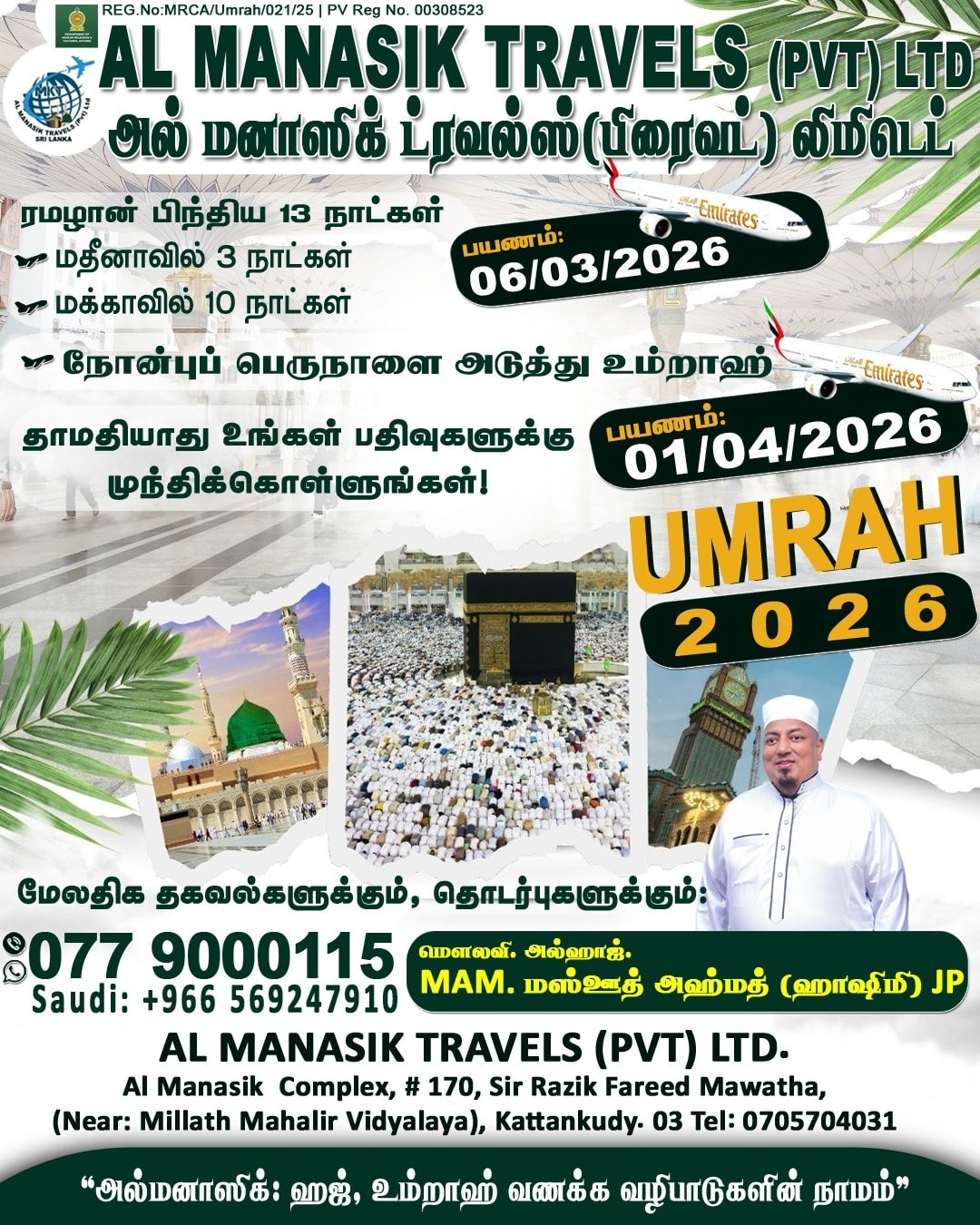 * நோன்புப் பெருநாளை அடுத்து உம்றாஹ் பயணம் : 01/04/2026