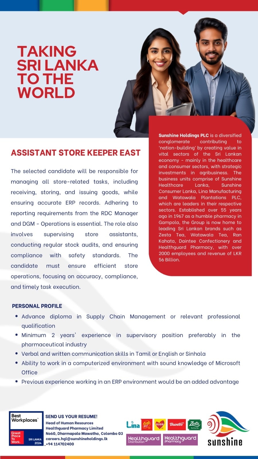Sunshine Holdings PLC நிறுவனத்தில் Assistant Store Keeper – East பதவிக்கு விண்ணப்பங்கள் வரவேற்கப்படுகின்றன.