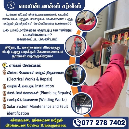 உங்கள் வீட்டில் மின்உபகரணங்கள், வயரிங், பிளம்பிங் மற்றும் வெல்டிங் வேலைகளில் பழுது மற்றும் திருத்தங்கள் செய்யவேண்டி உள்ளதா??