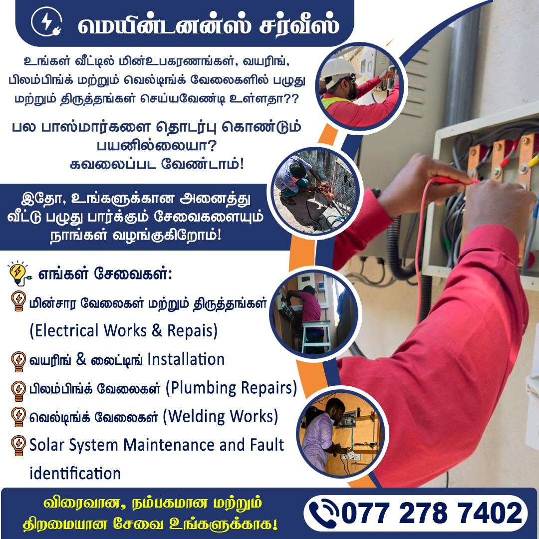 உங்கள் வீட்டில் மின்உபகரணங்கள், வயரிங், பிளம்பிங் மற்றும் வெல்டிங் வேலைகளில் பழுது மற்றும் திருத்தங்கள் செய்யவேண்டி உள்ளதா??