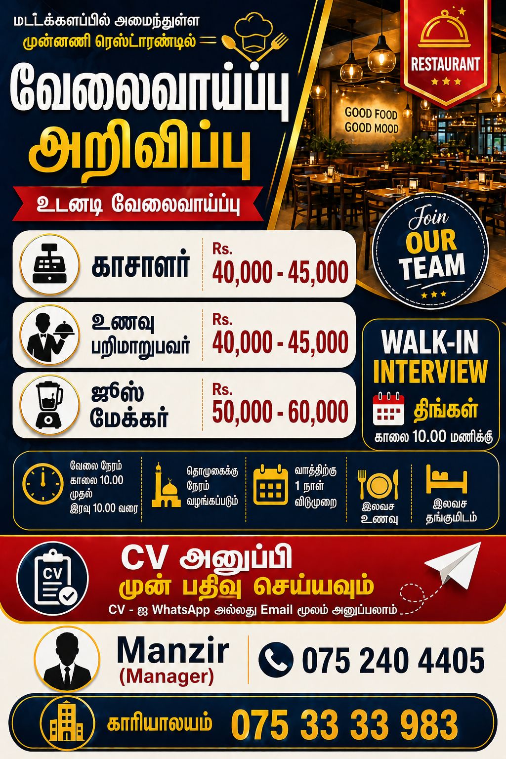 மட்டக்களப்பில் இயங்கும் பிரபலமான Restaurant ஒன்றிற்கு காசாளர் (Cashier), உணவு மரிமாற்றுபவர்கள் (Waiters) மற்றும் ஜுஸ் மேகர் (Juice Maker) தேவை
